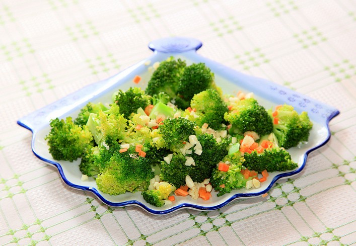 3、大蒜剥皮,切成蒜末,炒锅加油烧热,下一半蒜末翻炒出香味,倒入焯好的西兰花翻炒3分钟,加盐,出锅前把剩余蒜末倒下去翻炒一下即可。