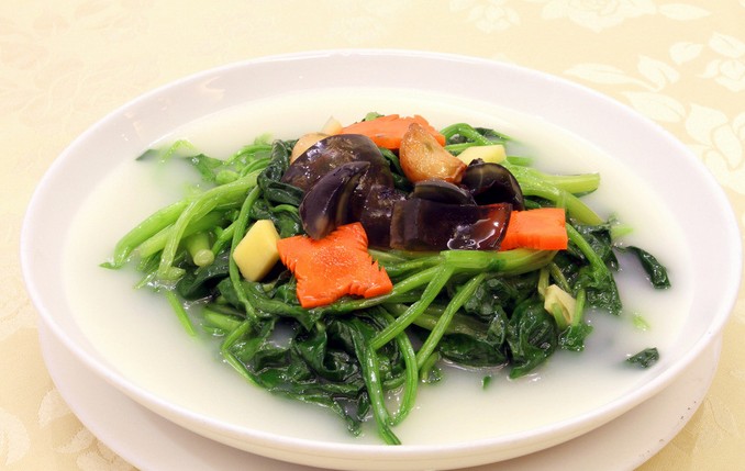 【原料】:菠菜1把、皮蛋1粒、咸蛋1粒、生姜3片、鸡汤100毫升、白胡椒粉少许、盐少许。