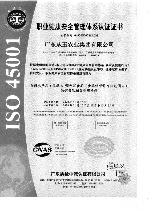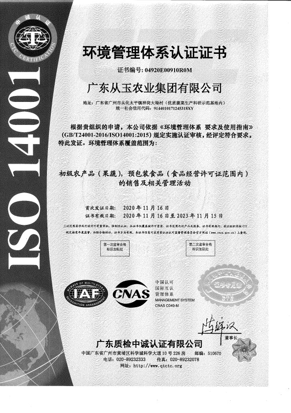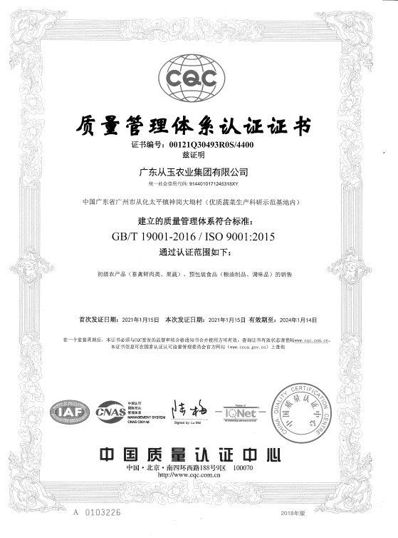 广东从玉农业集团有限公司获5个体系认证证书 | 从玉农业集团